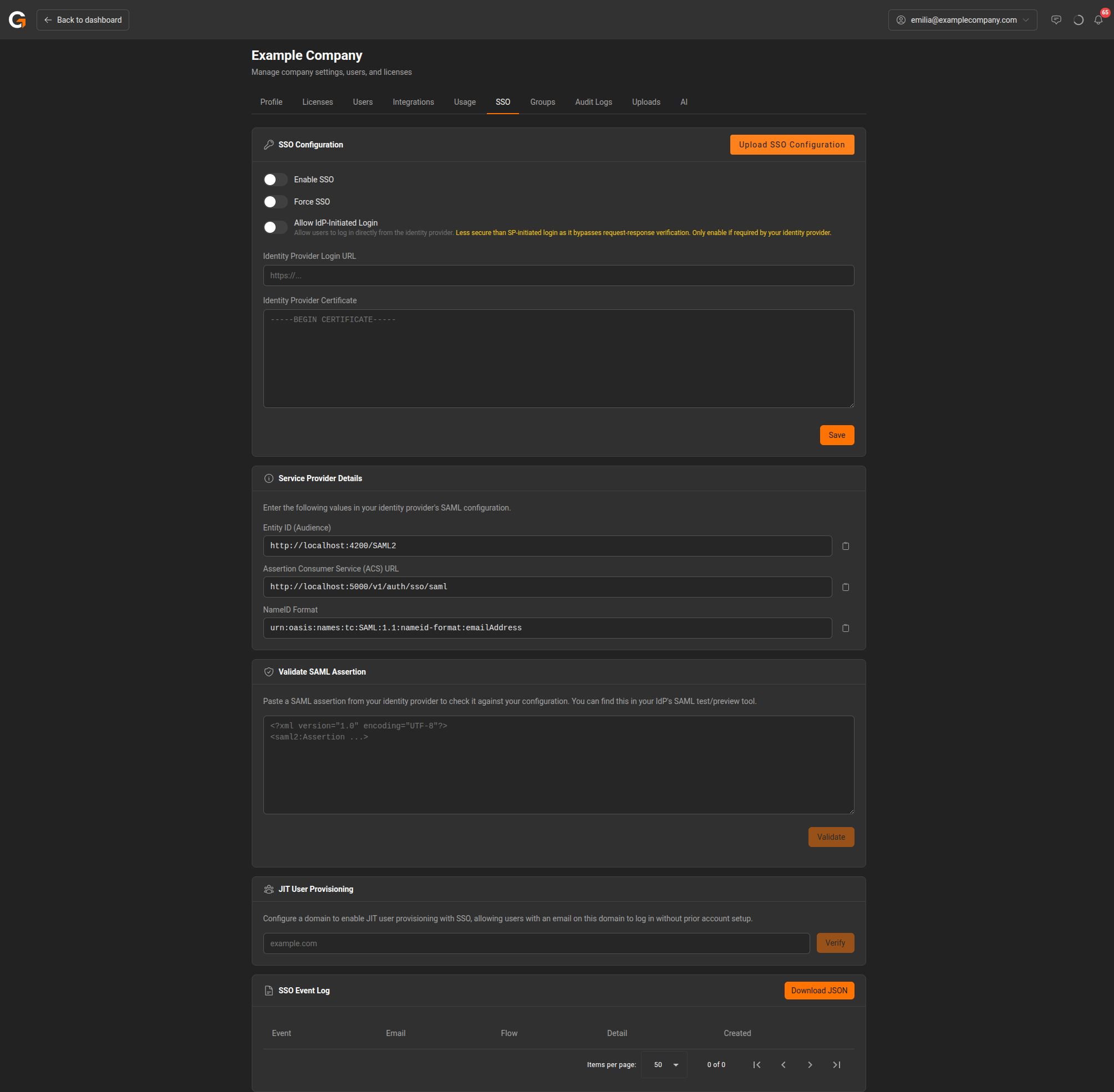 You can also upload your SSO configuration using the Upload SSO Configuration button.